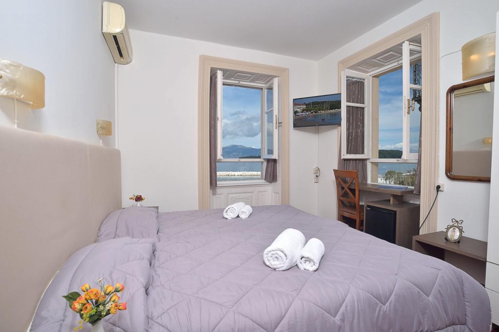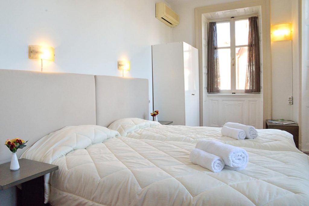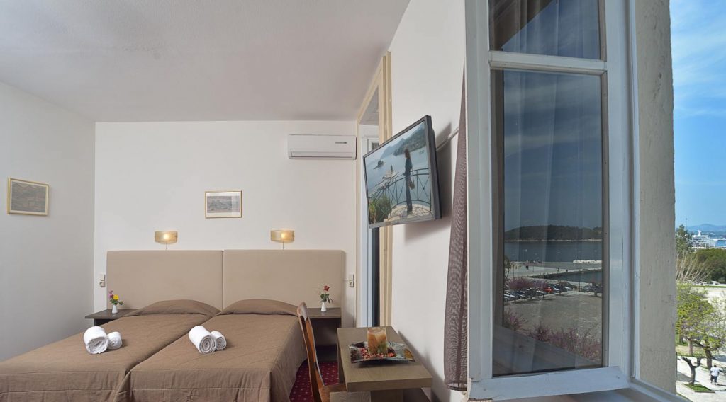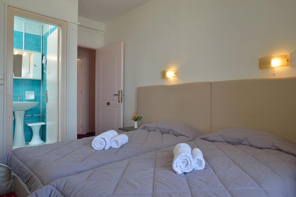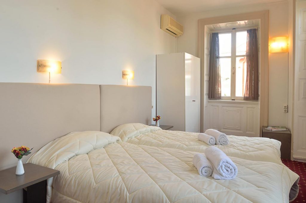 Twin room between 12-15 m2 equipped with 2 single beds 95x192cm, private bath, air conditioning, kettle (provided by the reception), hairdryer, T/V 32”, fridge and free WI-FI. This room faces the Old Harbor but without balcony.